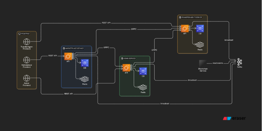 This architecture leverages various components to build a scalable, resilient, and efficient system. The API Gateway and Load Balancer manage client requests and distribute the load. The Admin and Marketplace services handle specific business logic and interact with MongoDB and Redis for storage and caching. Event Monitoring and Kafka manage real-time events and asynchronous processing. Blockchain integration provides an additional layer of security and transparency for critical data. The system can efficiently handle high loads and ensure smooth operation by decoupling services, caching, and asynchronous processing.