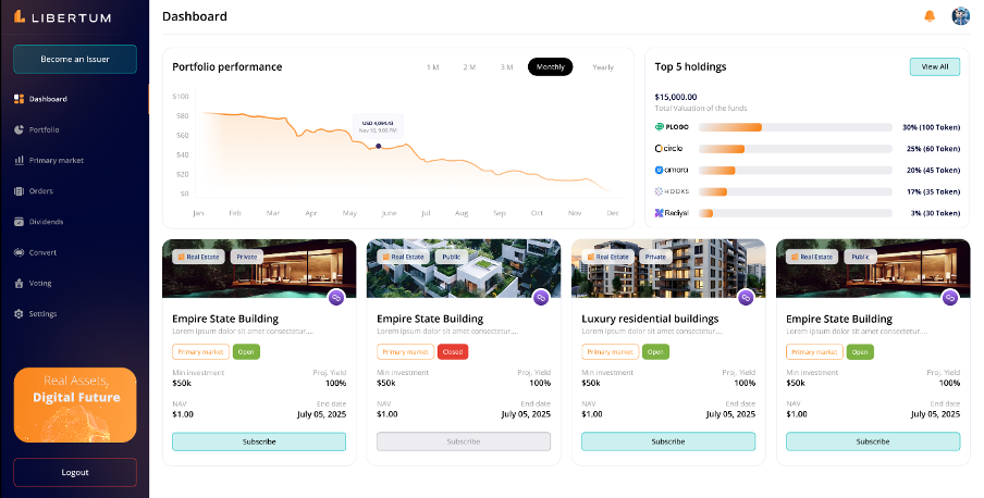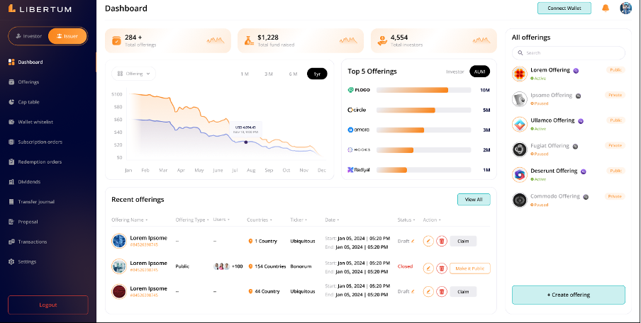 AUM Comparison (Line Chart): The dashboard features a line chart allowing Issuers to compare different offerings based on Assets Under Management (AUM). Issuers can select up to 5 offerings at once for comparison.