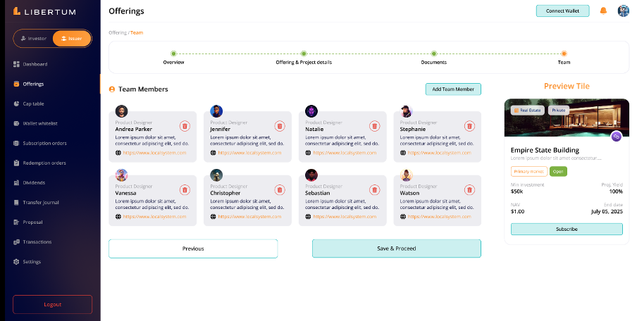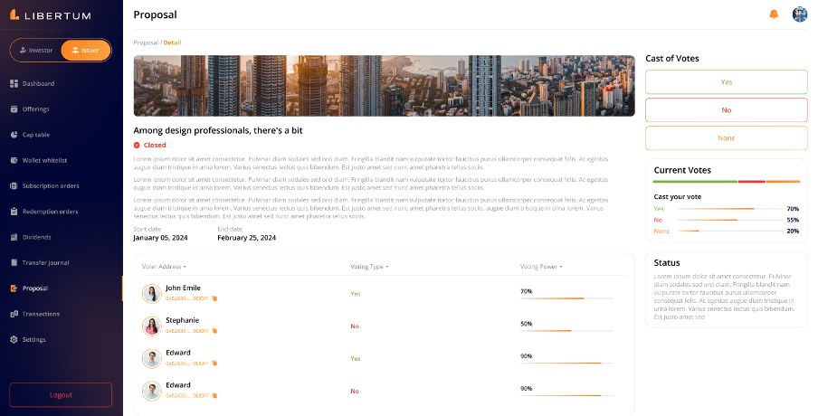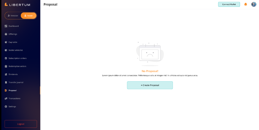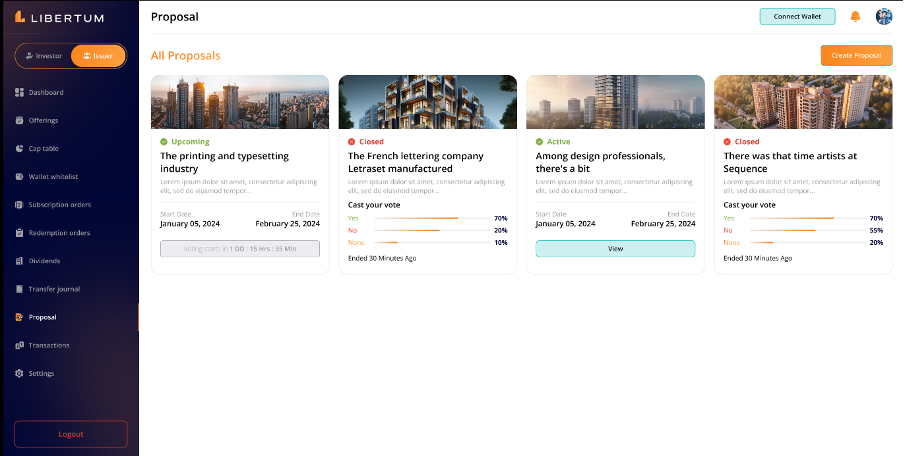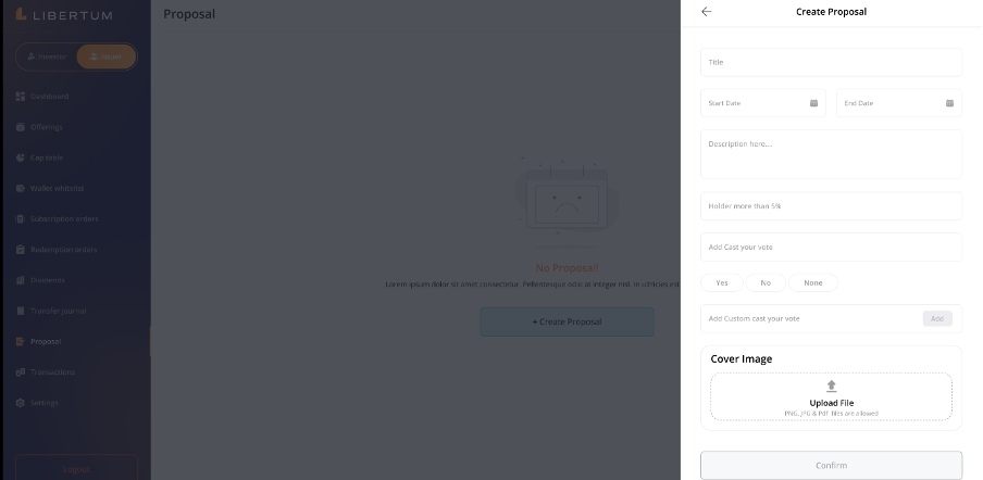 The Proposal section enables the issuer to create a proposal so that investors can participate in the voting process.