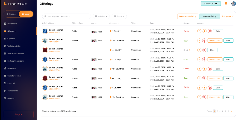 The “Recent Offering” on the “Dashboard” lets the Issuer view the latest 3 offerings they have created, displayed prominently on the dashboard. The table displays the following information about the offerings -