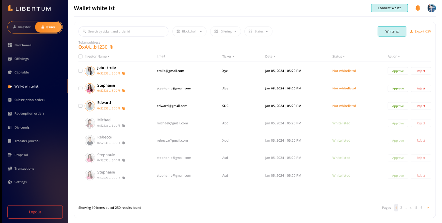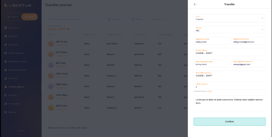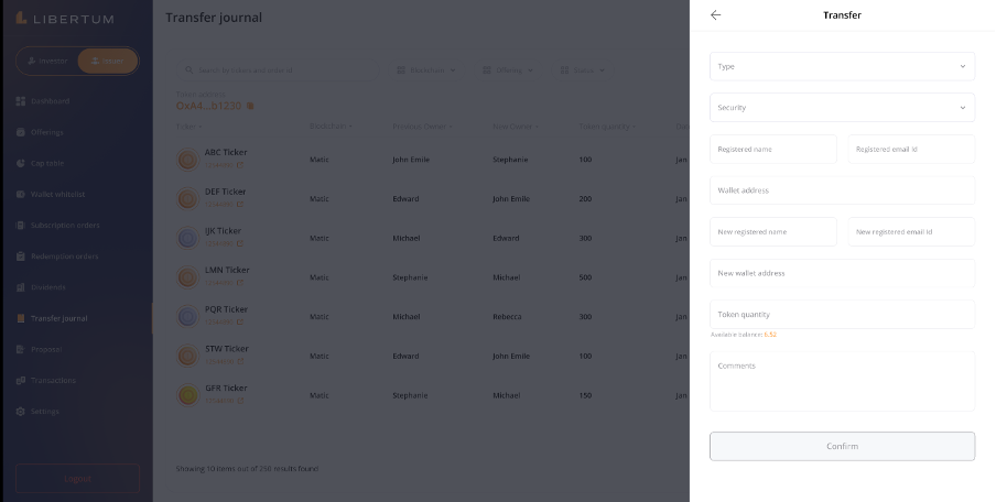 When an Issuer receives a transfer request from an investor to move tokens from one whitelisted wallet address to another, the request will appear in the “Transfer Journal” section of the Issuer persona.