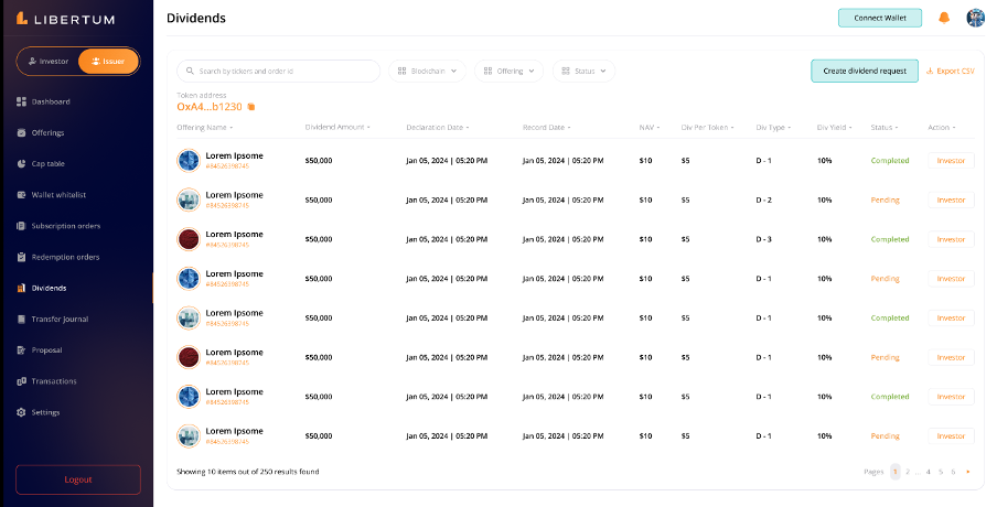 Once confirmed, the dividend request will be created and listed on the dividend management page.