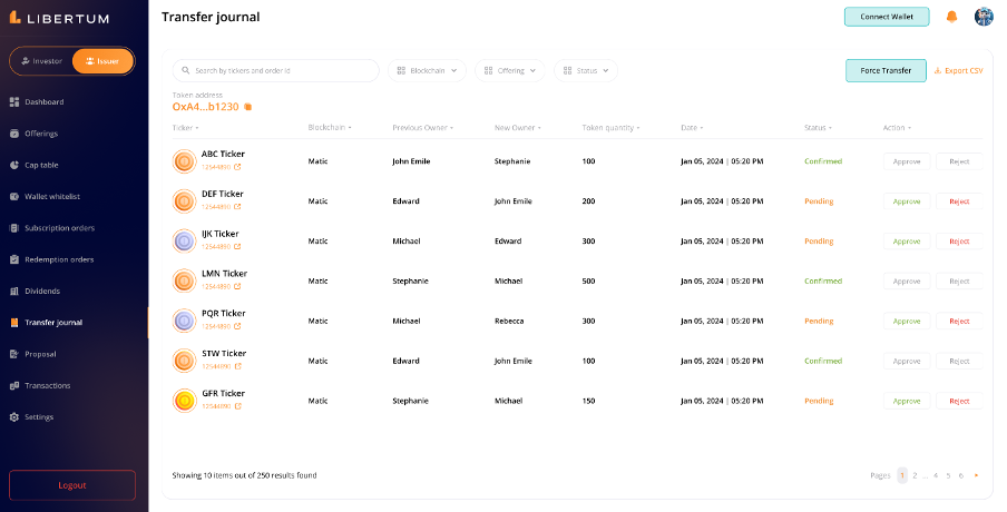 ● The Issuer can review the transfer request in the Transfer Journal and choose to approve or reject it.