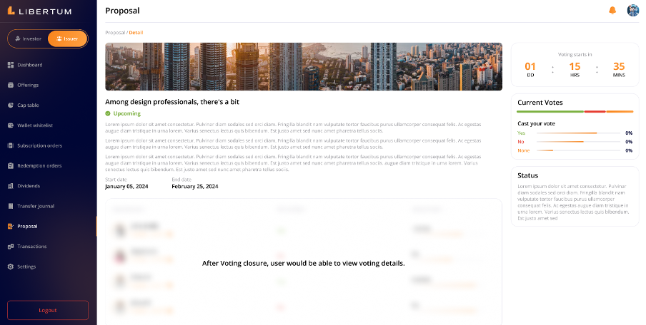The proposal will only be visible to investors holding tokens for the associated offering. Non-investors will not be able to view the proposal.