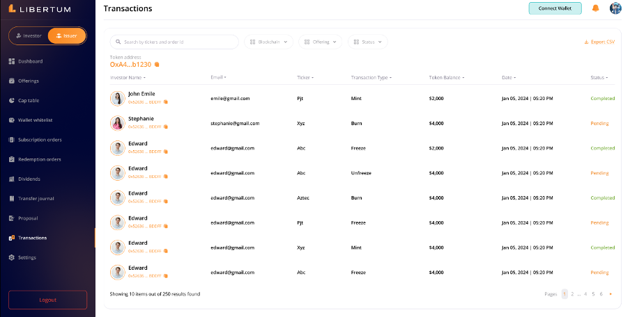 FR:085 The issuer must click on the “Export CSV” to export the CSV file of the transaction list, in CSV format for offline record-keeping or further analysis.