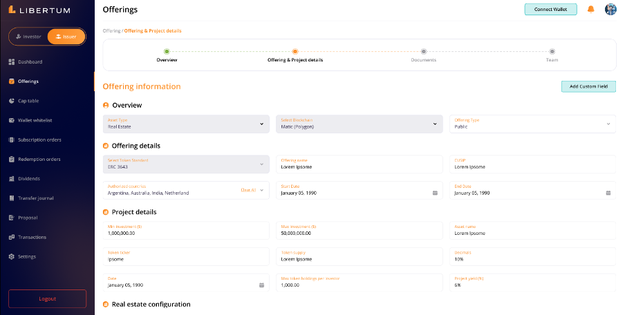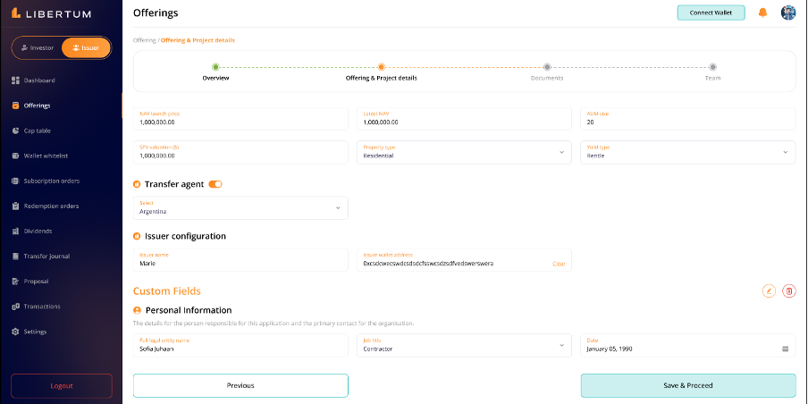 The “Offering & Project Details” section page contains the following information and the issuer must enter all the below details before they move to the next steps -