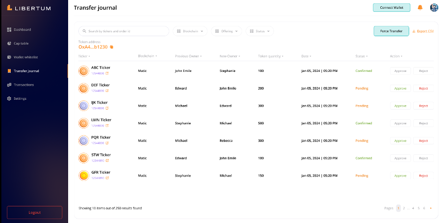 When a transfer agent receives a transfer request from an investor to move tokens from one whitelisted wallet address to another, the request will appear in the “Transfer Journal” section of the transfer agent persona.
