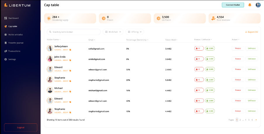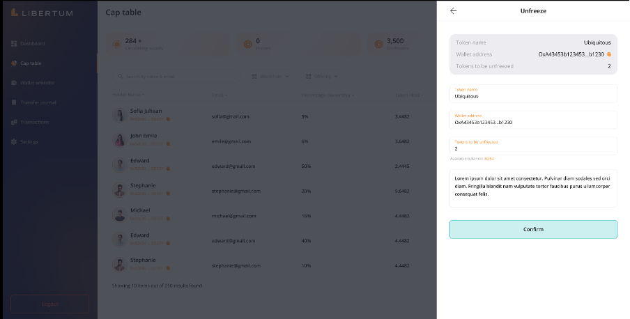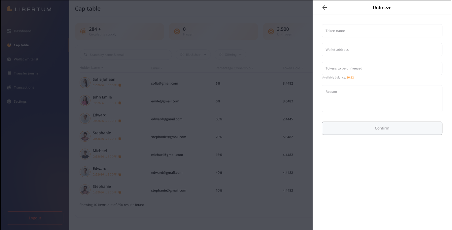 After clicking “Confirm,” the tokens will be unfrozen, the investor’s token balance will be updated, and an email notification will be sent to the investor regarding the unfreeze action.