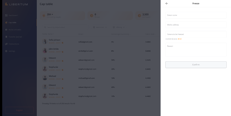 Upon clicking “Confirm,” the tokens will be frozen, the investor’s token balance will be updated, and an email notification will be sent to the investor regarding the freeze action.
