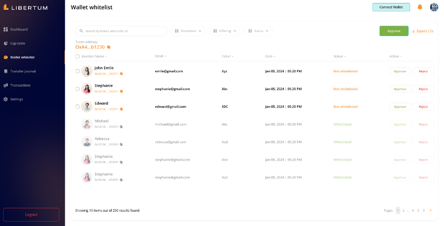 After selecting the desired investors, the Transfer Agent will click the “Approve” button to approve the wallets.